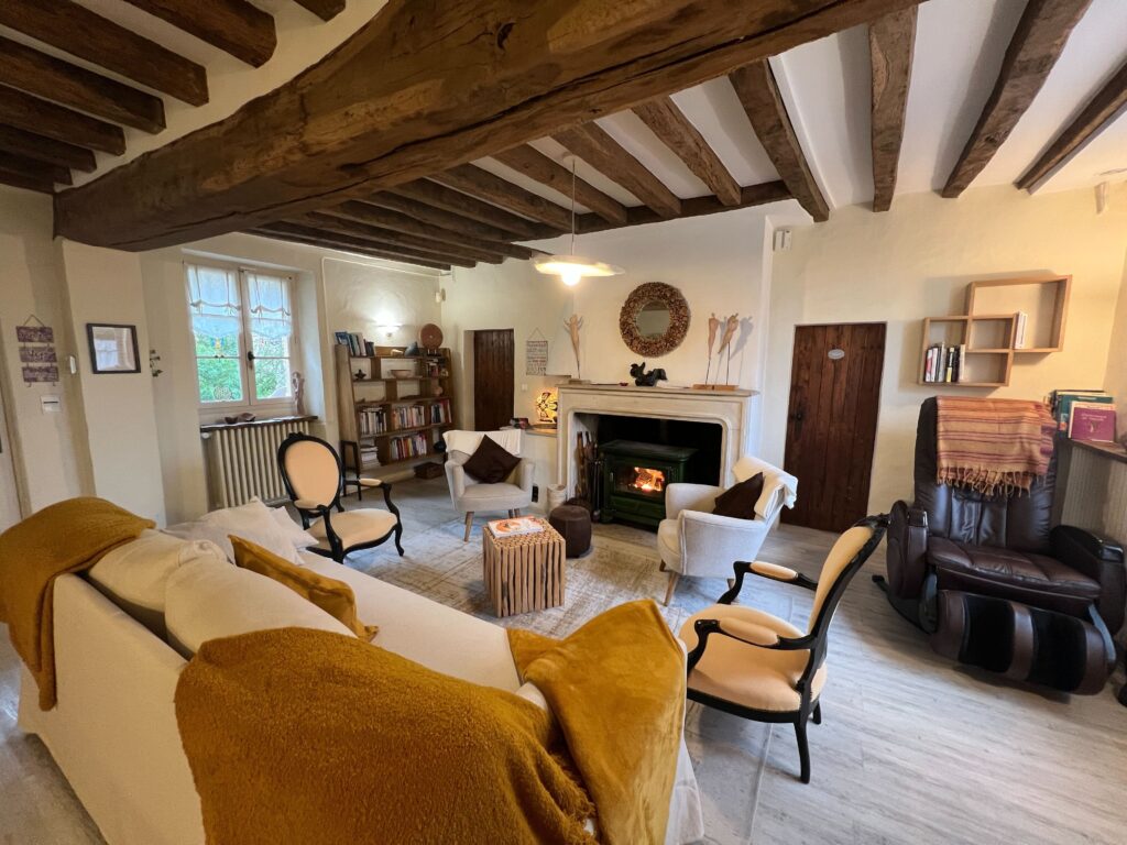 Nous accueillons jusqu’à 12 personnes dans une maison calme, en pleine nature. Le lieu fonctionne de manière participative et offre 9 chambres, plusieurs espaces communs chaleureux, une salle de groupe équipée, un espace d’entretiens individuels, un atelier d’artiste, ainsi qu’un spa complet et une salle de massage. Jardin, potager et forêt complètent le cadre. Les repas bio et végétariens sont préparés avec soin par notre cuisinière Adeline.